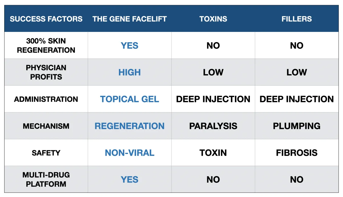 Introducing The Gene Facelift™. If approved by the FDA, this is the easiest and most effective “Yes!” in anti-aging skin therapy to date for both doctors and patients. Read on to discover the economic upside potential this breakthrough multi-drug Platform Technology brings to the market.